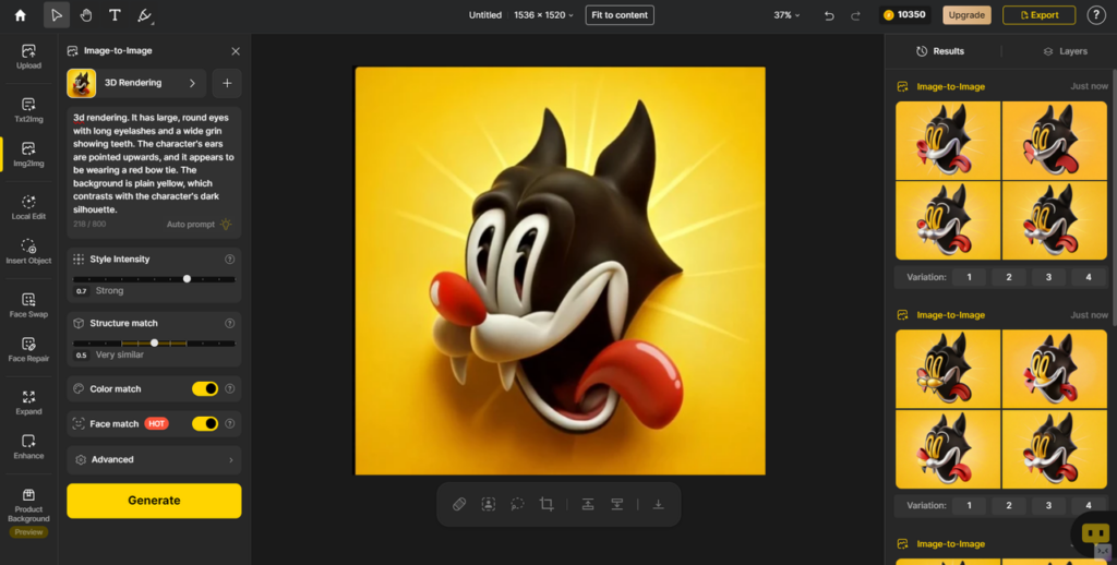 We also focused on improving the overall user experience. We introduced AI assistant tools like Auto Prompt , which helps generate creative ideas, and Color Match , which ensures color consistency across images. Additionally, we implemented a history log for generated images and significantly increased the number of available styles, giving users more options and flexibility.