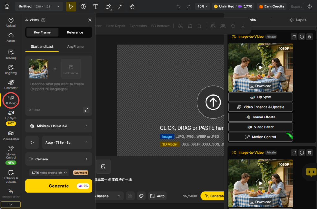 Step 2: Upload the start/end frame images or reference images and enter the prompt. Then, click Generate.