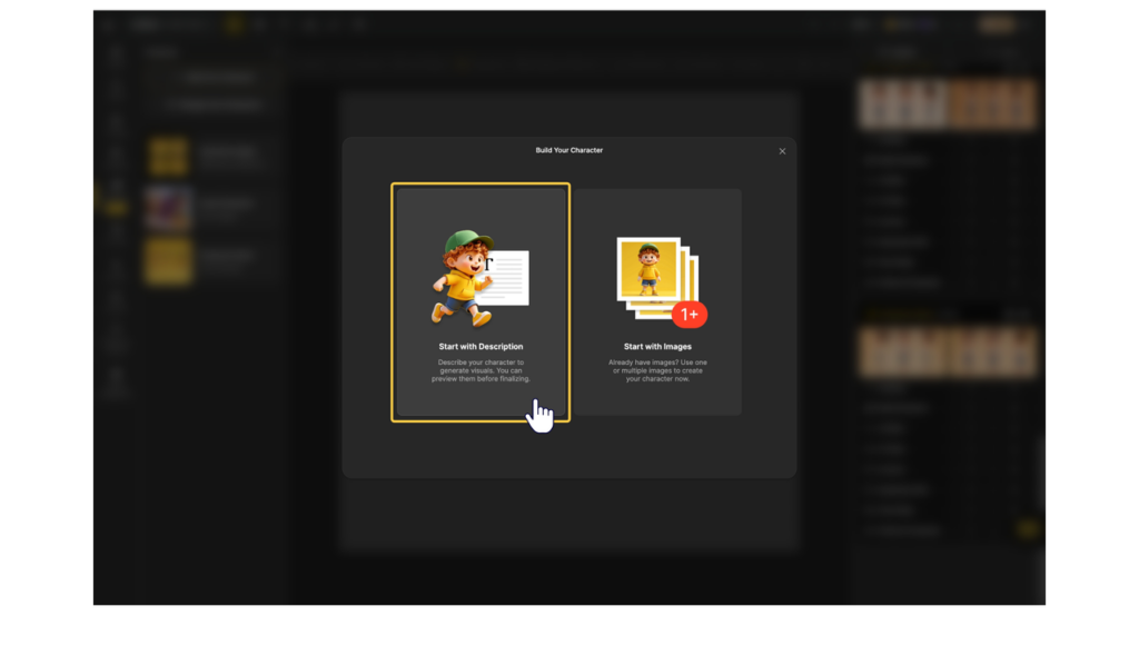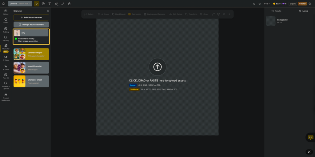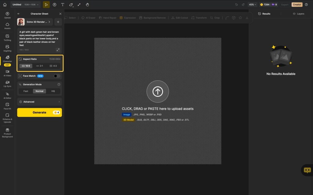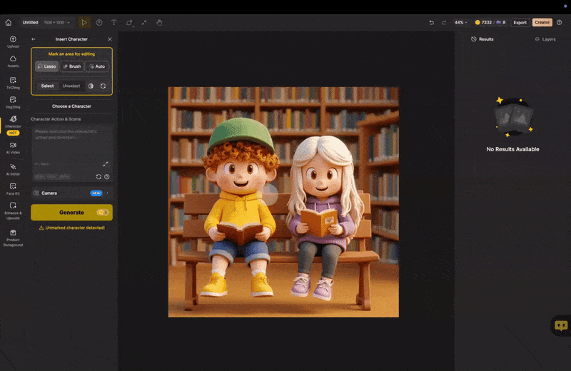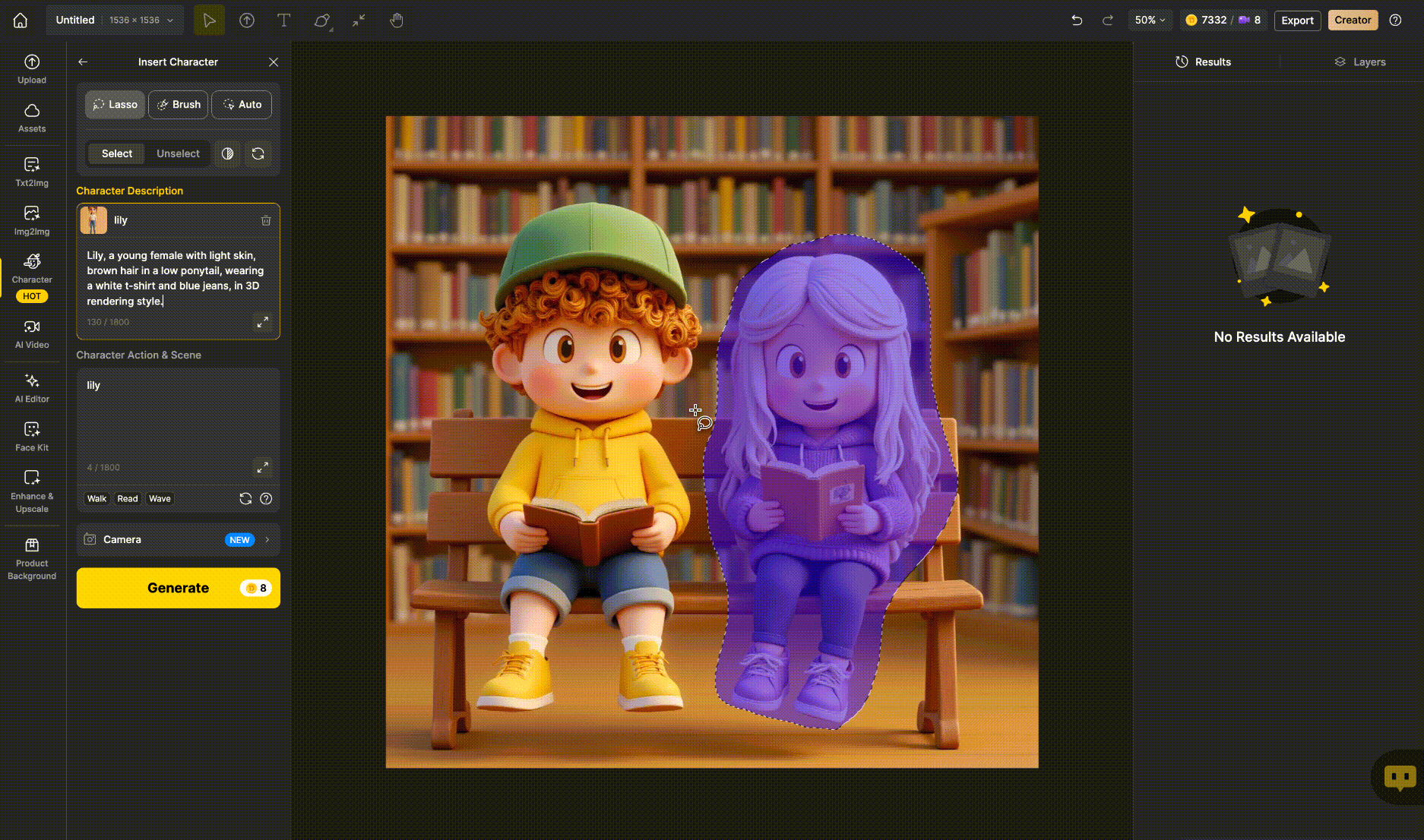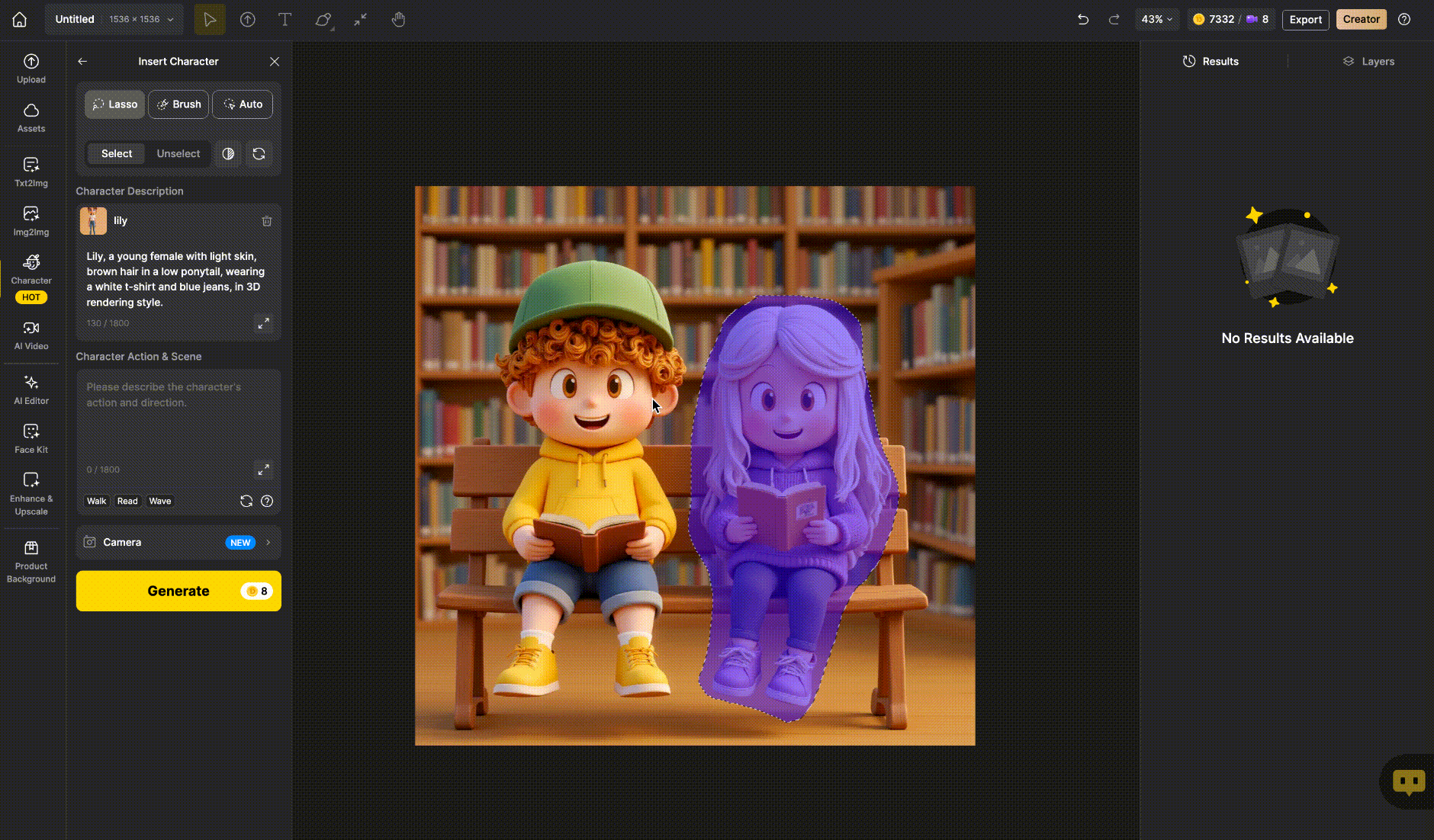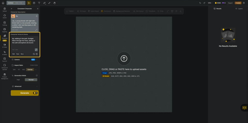 - Under ” Character Actions & Scene”, describe what you want the character to do.