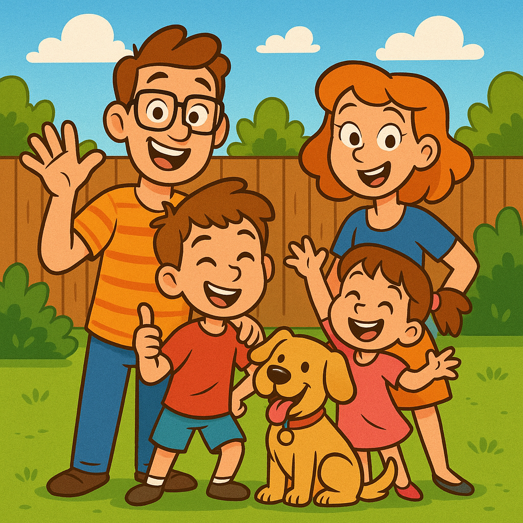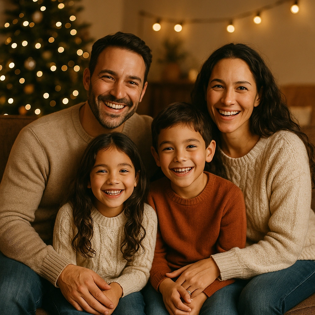 Describe your family, setting, and style. Mention details like clothing, expressions, and background for the best results.