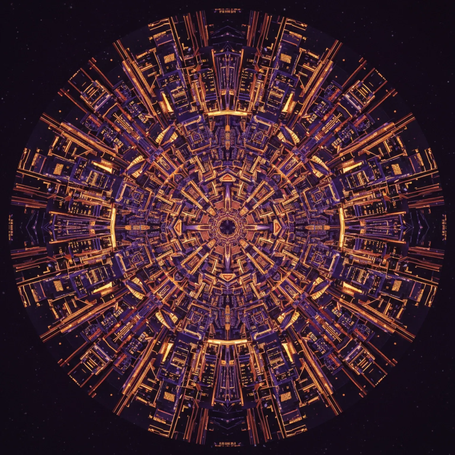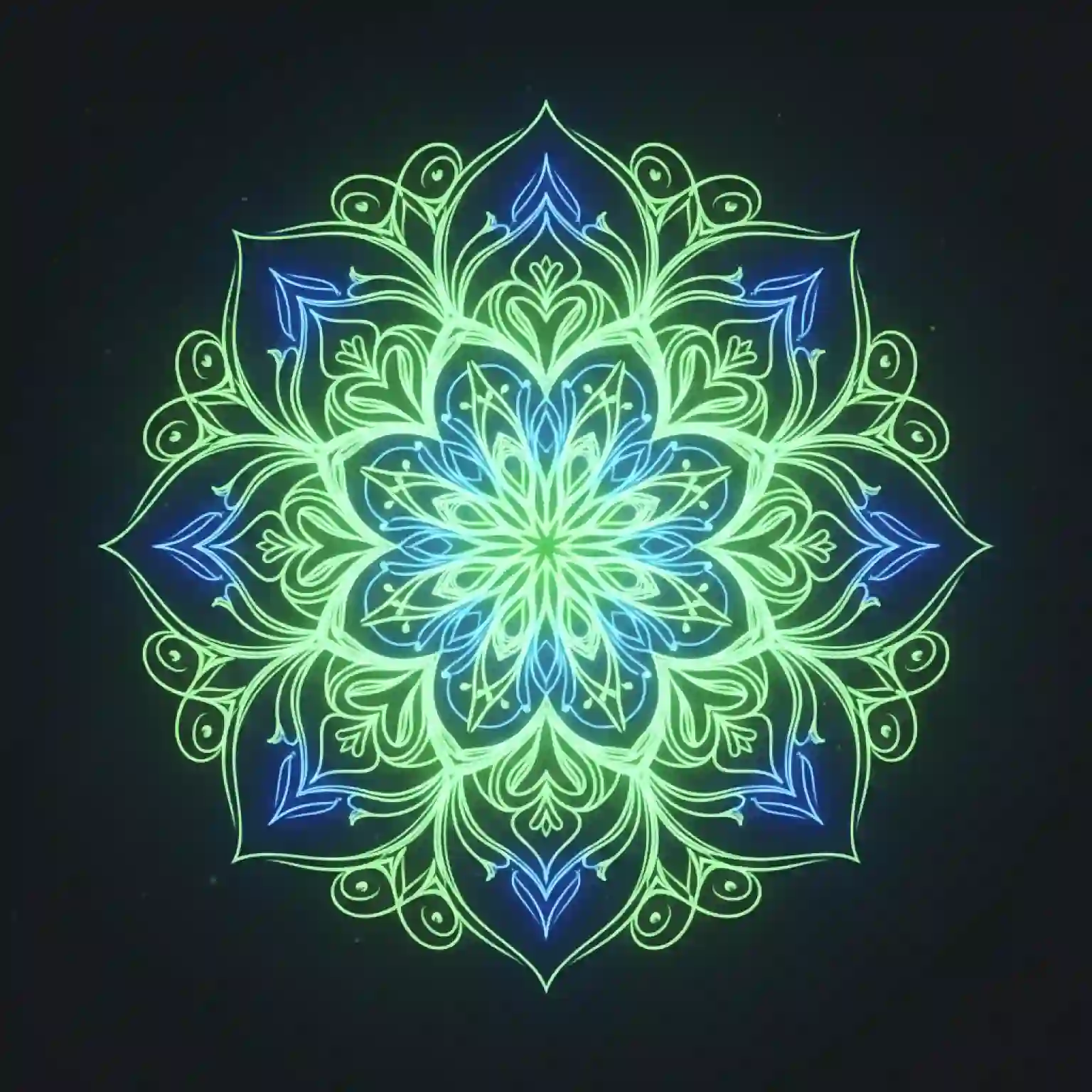 Tell us about the mandala's patterns, colors, and glow effects. Mention specifics like "a celestial mandala with glowing gold stars and deep blue neon lines" or "a floral mandala with soft pink and green glow."