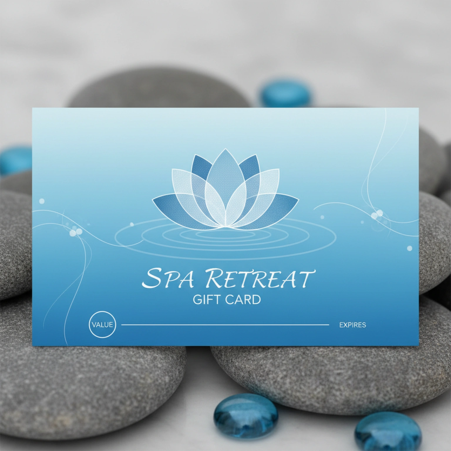Describe the gift card you want in simple terms. You can mention the occasion, color palette, layout, typography style, business name, card value, or even visual mood.